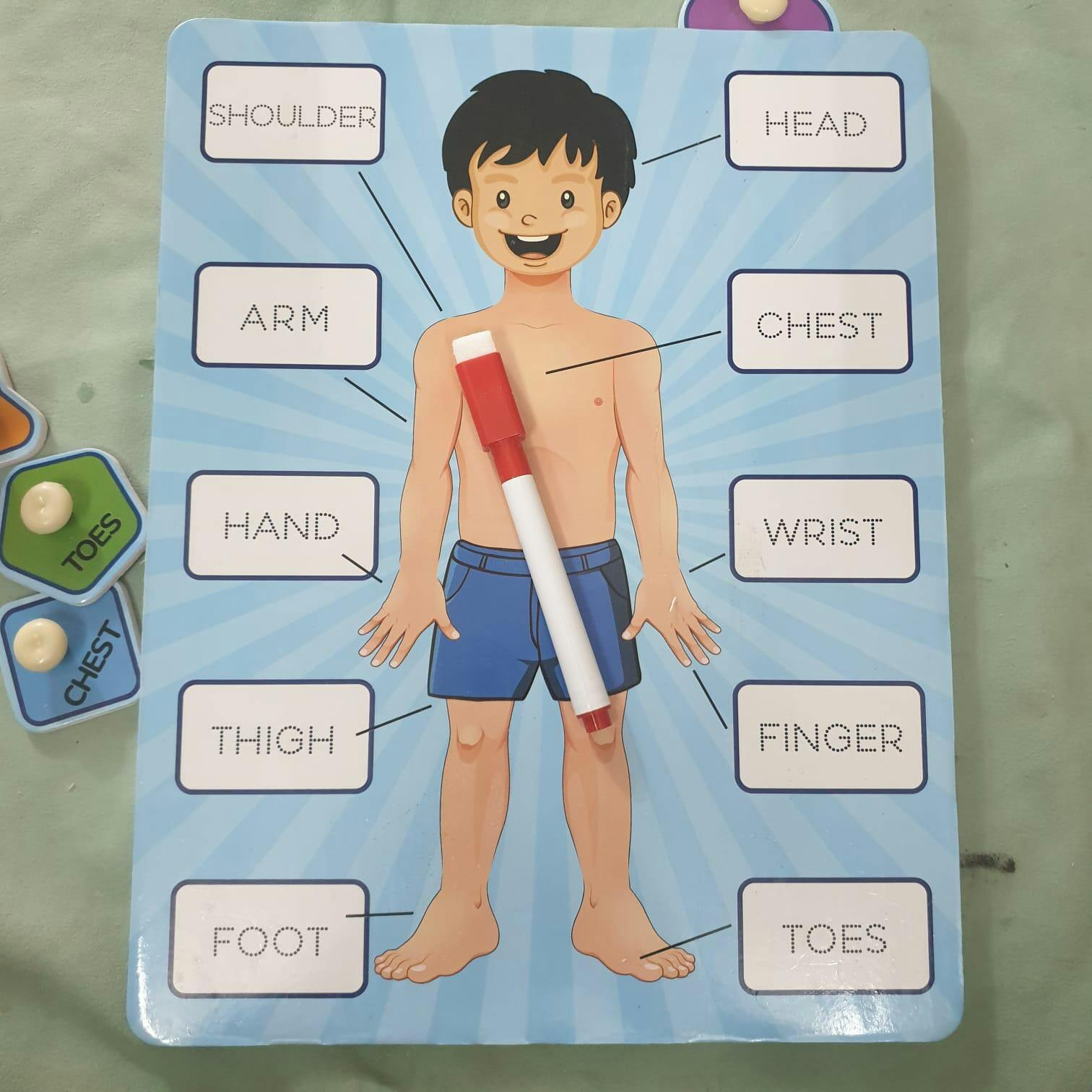 On the back, there is a tracing activity that further reinforces learning. The board comes with a marker included, allowing children to trace and practice writing as they learn about body parts. This dual-functionality makes it both educational and engaging.
